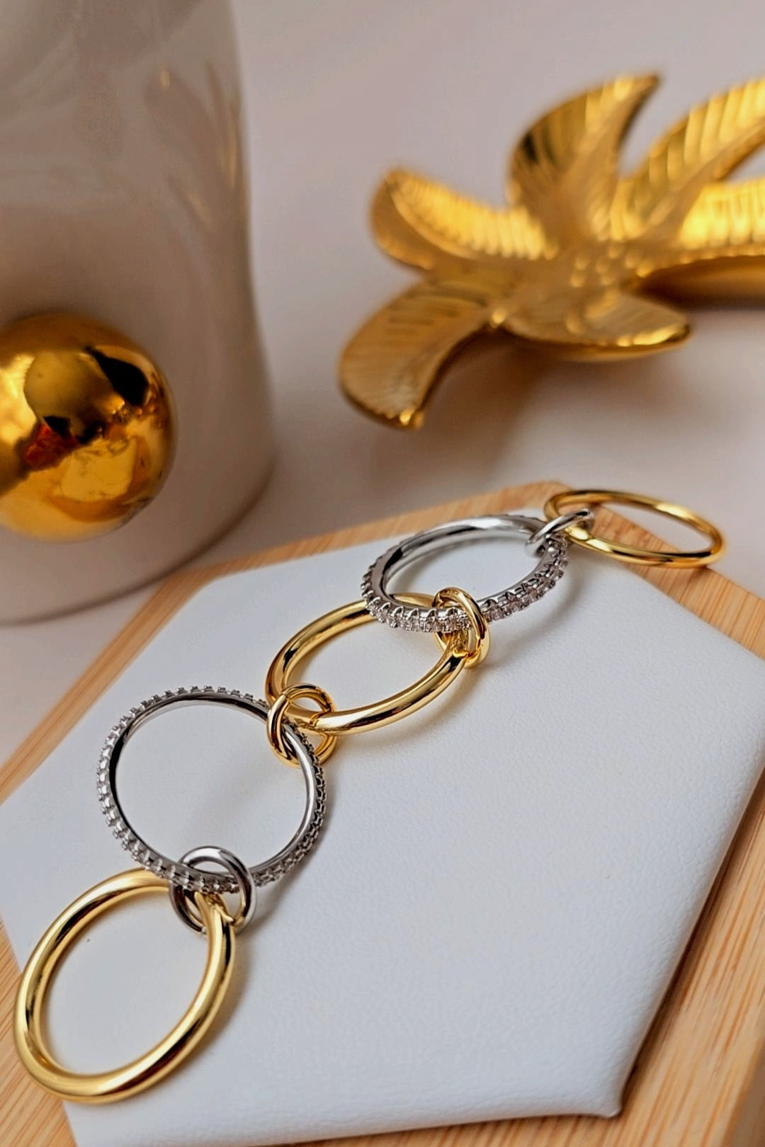 The Abstract Ring features multiple stacked bands in a harmonious blend of finishes: sleek, polished silver-tone and warm gold-tone. Adding dazzling texture, several bands are pavé-set with sparkling clear stones. The interconnected design creates a dynamic, visually intriguing, and wearable sculpture, designed to make a bold and sophisticated statement.