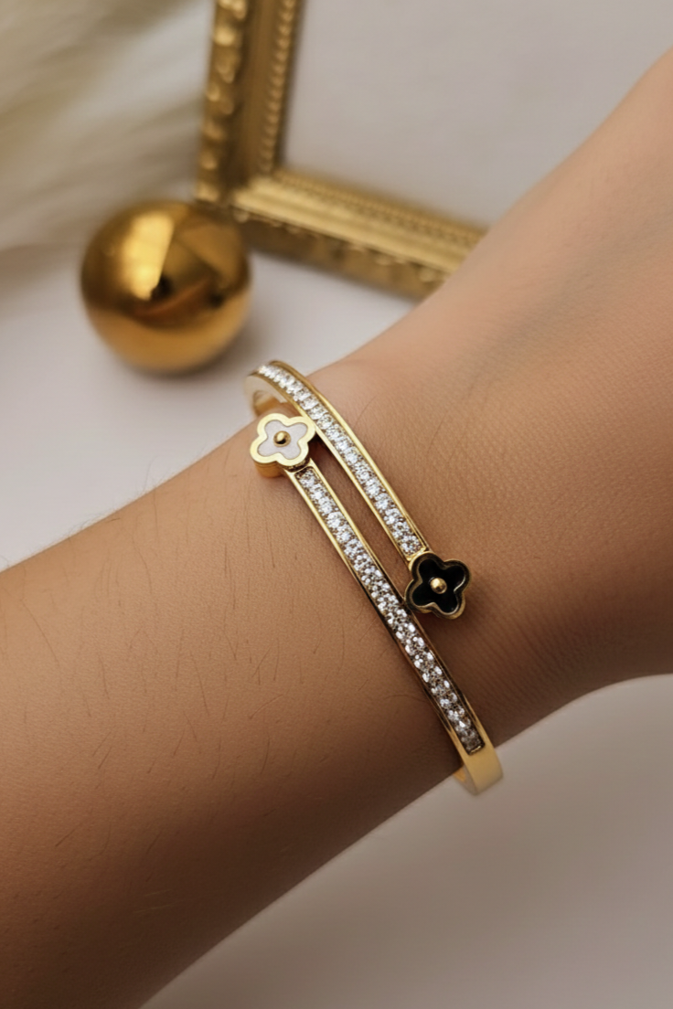 18K Gold Plated bangle bracelet with pearl clover flowers and tiny zircon crystals. This bold bracelet is perfect accent to your Summer or Winter outfit. Beautiful, popular and elegant design to add to your personal jewelry collection. It can be worn on its own, or stacked with other bracelets.